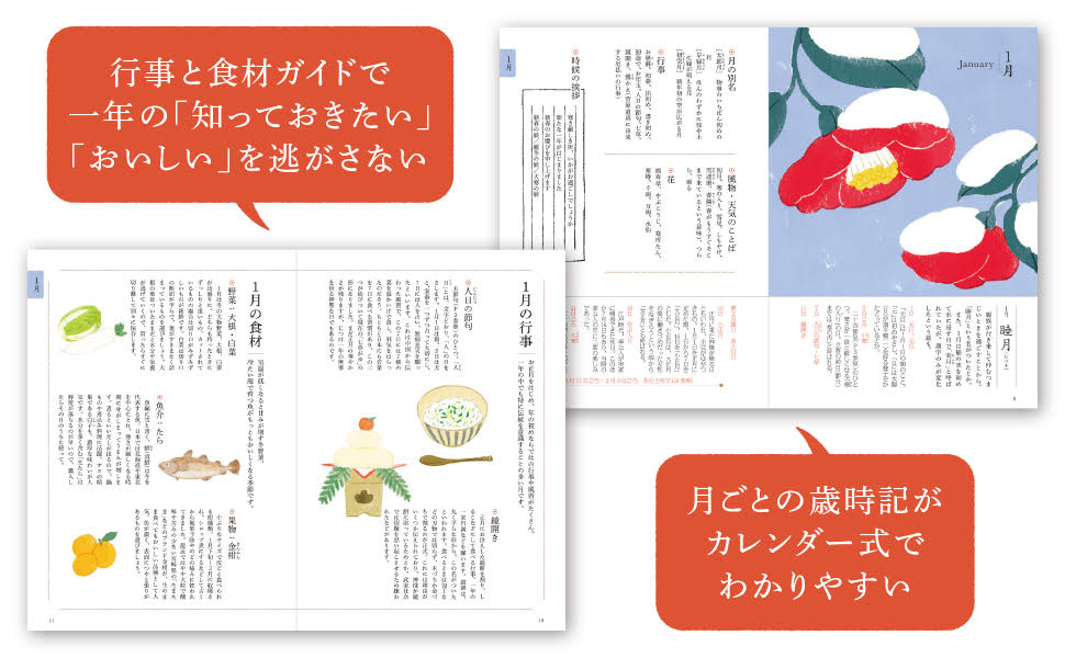 春夏秋冬の変化に恵まれた日本では、昔から家庭でも旬の食材や季節の節目を大切にする習慣がありました。一年の門出であるお正月の膳に始まり、春はちらしずしでお節句を祝い、秋は収穫に感謝して新米を楽しむ……など、食卓を彩る料理と四季の風物や気候は密接に結びついています。本書では、二十四節気や雑節などの和の歳時記とともに、一年12カ月の行事や旬の食材をまとめ、その月ごとにふさわしい家庭料理のレシピとともにご紹介。伝統的な和のおかずはもちろん、今どきの旬の味わい方を楽しむ料理も。季節がめぐるたびにページを開けば、「新緑がまぶしくなったら、かつおを食べよう」といった、日常をもっと豊かに過ごすためのヒントが見つかります。